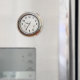 Tempo e Dinheiro. Um grande relógio atômico redondo com hgrometros e termômetros em uma parede com partes de uma variedade de dinheiro. time_clock_money_wall_OPT300tsRGB.jpg