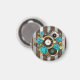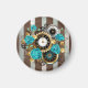 Relógio antigo e patenteado, adornado com joias, mãos de ouro e algarismos latinos com rosa de turquesa sobre fundo castanho e listrado. Estilo Steampunk.