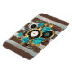 Relógio antigo e patenteado, adornado com joias, mãos de ouro e algarismos latinos com rosa de turquesa sobre fundo castanho e listrado. Estilo Steampunk.