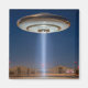 Un vaisseau spatial en forme de soucoupe volante planant au-dessus d'une installation militaire clôturée qui est supposée être la zone 51 ou area 51. Un puissant rayon lumineux descend du centre de l'OVNI vers l'entrée d'une zone restreinte, éclairant la nuit étoilée et l'espace désertique environnant.