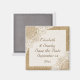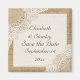 Lace branca elegante sobre magnete "Save the Date" shabby chic em juta, apresentando renda branca sobre juta natural ou hessian que cobre dois cantos de um retângulo branco com borda de juta bege. Texto em marrom. Observe que a renda e a juta são todas "impressas" e não tecido real. Este sofisticado e romântico design elegante, shabby chic com uma essência rústica faz parte de um conjunto de casamento e é perfeito para um casamento country chic ou western na primavera, verão ou outono com uma paleta de cores neutras.