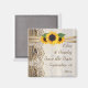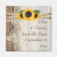 Lindo convite de casamento em ímã com renda branca, fita, girassóis e madeira, apresentando renda branca em madeira com duas fitas de cetim cruzadas e girassóis. Texto em marrom. Observe que a renda, a madeira e os girassóis são todos "impressos" e não tecido ou flores reais. Este design elegante, sofisticado e romântico com uma essência rústica faz parte de um conjunto de casamento e é perfeito para um casamento country chic ou western no outono com uma paleta de cores neutras.
