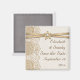Lace branca elegante, fita e flor em burlap no Save the Date de casamento, apresentando lace branca em burlap natural de linho ou hessian com duas fitas de cetim cruzadas e flor bege com brilho metálico e uma joia branca. Texto em marrom. Observe que a lace, o burlap, a flor e a joia são todos "impressos" e não tecido real, gema ou cristal. Este design elegante, sofisticado e romântico com uma essência rústica faz parte de um conjunto de casamento e é perfeito para um casamento country chic ou western na primavera, verão ou outono com uma paleta de cores neutras.