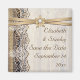 Lace branca elegante, fita e flor em madeira casamento Save the Date ímã com lace branca em madeira velha marrom com duas fitas de cetim cruzadas e flor em bege com brilho metálico e uma jóia branca. Texto em marrom. Observe que a lace, madeira, flor e jóia são todas "impressas" e não são tecido, madeira, gema ou cristal reais. Este design sofisticado e romântico, shabby chic elegante com uma essência rústica faz parte de um conjunto de casamento e é perfeito para um casamento rústico country chic ou para um casamento western na primavera, verão ou outono com uma paleta de cores neutras.