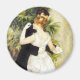 Renoir Dança no ímã da cidade. Pintura a óleo na canvas de 1883. Uma das famosas pinturas de casais dançantes de Pierre-Auguste Renoir, Dance, na cidade, retrata uma mulher com cabelo castanho claro balançando com um homem de smoking. A mulher veste uma flor rosa no cabelo, luvas brancas compridas e um vestido de seda branco que flui. O casal parece estar dançando em um salão rico enfeitado com frentes de palma e plantas tropicais. Um presente bonito para fãs do Renoir, dança, casais românticos e impressionismo.