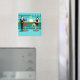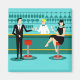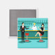Cada hora é feliz com este Retro Cocktail Lounge Magnet. O design moderno do meio século apresenta um vibrante estilo, minimalista, de 1960 desenho de um bar de coquetel clássico. Contra o pano de fundo de uma parede aqua, podemos ver filas de óculos de bebida. Pelo menos podemos ver os teais silhuetas de óculos de bebida. A julgar pelas formas do material, este bar está bem equipado para molhar o assobio, seja qual for a sua preferência pela bebida. Um barman mais competente e personável é manejar o bar com sotaques amarelos. O jovem barman está vestindo uma camisa branca e primitiva com gravata arco preta. Sua boa aparência, cabelo louro e óculos de hipster pretos nos dão todas as razões para acreditar que ele passa seus dias como um ator em luta ou um super-herói. Por um lado, o bonito mixologista está entregando um martini a um cliente do lado oposto do bar. O cliente que espera é um cavalheiro de ombros largos com um terno preto e gravata vermelha. Ele é o tipo de sujeito que é descrito como alto, escuro e bonito mesmo quando ainda é horas até a hora de fechar. Parece que há um banco de bares vermelho e cromo com o nome do Sr. Debonair. No entanto, para não ser presunçoso, ele pergunta, "Desculpe-me. Este assento está ocupado?" Ele está perguntando à garota cabeleira no banco de bares vizinho. Ela é do tipo "garota ao lado", se você vive ao lado de uma beleza perfeita com uma figura que não desiste. Ela está vestindo um vestido preto e segurando um martini em uma mão. Ela espera que ela e o cavalheiro que se aproxima tenham mais em comum que a sua preferência pela bebida e a escolha da cor da roupa. Parece que esta noite ficou interessante. Saúde para você!