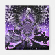 Roxo e preto, notas de música com imagens de pessoas festejando em uma reunião.
