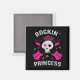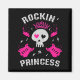 Um design bonito apresenta um crânio com olhos em forma de coração e duas guitarras elétricas cruzadas, e a citação "Princesa Rockin'".