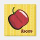 Uma pimenta-pimenta-do-rococô vermelha é decorada com padrões inspirados nos tecidos coloridos do Peru e se senta sobre um fundo amarelo com uma versão menor do mesmo padrão e uma etiqueta de roteiro no canto. Este pimento picante é consumido no Peru e na Bolívia e tem sido cultivado na região desde os tempos pré-índios.