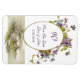 Design floral elegante com flores violetas roxas e uma bela paisagem rural romântica;lago, águas, árvores, cabana rústica, campos verdes, elaboração gráfica digital ao estilo da vintagem por Búlgaro Lumini.Fácil de personalizar com seu próprio texto como um anúncio, cartões de lugar, cartões guardados, cartas de agradecimento, chás de panela, doces 16 aniversários, festas de noivado, ou sobre qualquer evento que você desejar!
