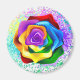 Rosa grande e florescente com pétalas arco-íris sobre fundo branco, pintadas com pedaços de tinta colorida e brilhante. 3d