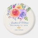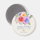 Ímã para salvar a data do casamento com um caprichoso buquê floral com rosas em aquarela. Sofisticado, caprichoso e criativo. Um ramo de rosas em rosa, roxo e amarelo. Com muitos ramos e folhas em verde, rosa, roxo e azul. O fundo é uma cor champanhe bege esbranquiçada. 2 alianças de casamento douradas colocadas abaixo do texto.