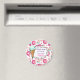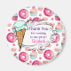 Um obrigado de festa de aniversário fofo personalizado, seu ímã. Um sorriso com um design de padrão delicioso. Rosquinhas cor-de-rosa com aspersores. Cupcakes de abeberamento da boca, cor-de-rosa e azul, com rosetas e morangos em cima. Algumas macaronas pastel cor-de-rosa e pequenos botões de doces cor-de-rosa também decoram este padrão de cheios doces. Um quadro branco em um estilo desenhado à mão no centro para você personalizar com seu nome. Com um cone de sorvete verde da casa da moeda ao lado