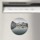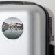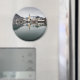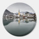 Fotoímã redondo com uma cena de inverno com reflexo da torre amarela da igreja na água do lago Tegernsee e com neve nos telhados das casas da cidade de Rottach-Egern com as montanhas dos Alpes no fundo da Baviera (Bayern), Alemanha.