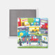 Artista: Marcus Cutler | ilustração de uma zona de ocupação urbana e ponto de ônibus com peões e carros, caminhões e compras e um rapaz de bicicleta