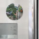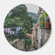 Pintura de ruas estreitas com prédios de pedra, flores, roupa suja pendurada e escadas na Cidade Velha, Dubrovnik. Seca pendurada numa típica fachada croata. Rua estreita com prédios de areia branca.
