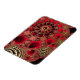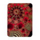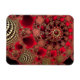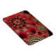 Um desenho fratural brilhante com espirais ornamentados de vermelho escuro e vívido, sobrepostas com filigrana de ouro como conchas metálicas e estudadas com rubis reluzentes.