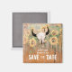 Rúsculos girassóis de casamento salvam a imã de geladeira de dia anunciada. Crânio de rodeio ocidental com textura floral dos chifres. Madeira de celeiro apresenta cores verdes amarelas castanhas. Design do estilo de vaqueiro da fazenda. Imagem copyright Marg Seregelyi Fotografia.