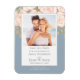 Este design apresenta ímãs de salvar a data de casamentos, tipografia de noivado minimalista rústica elegante moderna tradicional simples, casais de aquarela magnética de verão, envie sua foto de flores de aquarela, convites de casamento de letra cursiva moderna, casamentos rústicos modernos no campo, uma fonte de letra cursiva moderna, com rosa peônia simples floral, folhagem botânica verde de primavera com um fundo azul poeira.