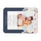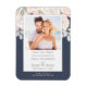 Celebre o seu amor com este ímã de casamento "save-the-date", apresentando um modelo de foto elegante acentuado por flores cor-de-rosa e folhagem botânica verde. O fundo azul escuro adiciona um contraste marcante, enquanto a tipografia minimalista e o design simples oferecem um charme atemporal. Perfeito como um cartão magnético de noivado, esta peça destaca lindamente a sua fotografia clássica de noivado, criando um presente romântico e suave que os seus convidados irão guardar com carinho.