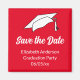 Um boné de formando branco está acima de 'Salvar a Data' em um script branco. Três linhas de texto em branco estão na parte inferior. Você pode editar o texto para mostrar o nome do formando, uma mensagem personalizada e a data do evento.