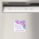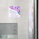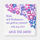 Bonito Save the Date imã de geladeira, com flores rosa, azuis e roxas, de uma colagem de papel pintada à mão por Judy Adamson