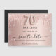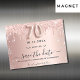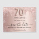 Uma placa feminina Save the Date para uma festa de aniversário 70. fundo rosa de gradiente dourado decorado com rosa dourado e gotas luminosas de prata sujas. Personalize e adicione uma data e um nome/texto. O texto: Salvar a Data é gravado com um script de estilo com letra de tendência grande com alternâncias. Número 70 com uma fonte no estilo do balão.