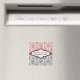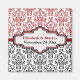 Imã salve a data casamento tema damasco vermelho preto. A parte superior é de cor damasco vermelha e branca e a parte inferior é de preto e branco. Uma faixa vermelha separa as duas partes. Seu texto é digitado em um rótulo elegante com contorno branco e vermelho.