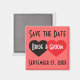 Este ímã "Save the Date gelator" apresenta corações pretos e vermelhos sobrepostos pelo texto do modelo "bride and groom". O texto modelo "save the date" (salvar a data) é exibido acima dos corações e o texto modelo para a data é exibido abaixo. O design pode ser personalizado para uma festa de noivado, chá de panela, janto de ensaio, casamento, aniversário ou salvamento do dia de os namorados ou a favor da festa.