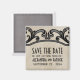 Imã salve a data de pássaros légicos e góticos apresentando um fundo bege texturado vintage e bordas onduladas florescem em cinzas. Este design antigo é perfeito para anunciar seu gótico ou casamento vintage. Fácil de personalizar, basta adicionar os detalhes do casamento nos campos de texto fornecidos. Clique em "Personalizar" para encontrar mais opções de personalização.