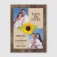 Casamento de madeiras russas e de girassol amarelo, salve o cartão de data. Há duas modelos de fotograma que você pode mudar para suas próprias fotos de noivado. Este casamento de girassol rústico salvou o cartão de ímã de data tem uma simulação de madeira ou fundo de madeira em um marrom médio a escuro. Há um girassol amarelo bonito no centro médio sobre as duas fotos (uma no canto superior esquerdo e outra no canto inferior direito). Todos os textos são perfeitamente personalizáveis. Este é um belo casamento fotográfico. Salve o ímã de encontros para um casamento temático de girassol no verão do outono / outono.