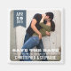 Moderno, porém com um talento rústico, uma foto do belo casal preenche a moldura, e uma bonito faixa azul de cinza furada segura o mês, dia e ano da data do casamento. Um imã perfeito para deixar os hóspedes saberem sobre o noivado e a data do casamento.