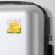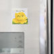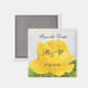 Uma Imã salve a data com letras de script e espaço para seu texto personalizado, decorada com uma bonito rosa amarela em um fundo creme e azul-céu.