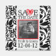 Imã salve a data com cores vermelha, preta e branca. Damask, fundo do padrão floral em preto sobre fundo branco. Quadro de foto branco de borda variável com as palavras SALVAR A DATA em letras maiúsculas. O "v" dobra como um coração vermelho. Estilo Vintage, damask com campos personalizados para a data, nomes e fotos do noivo e do noivo.