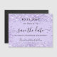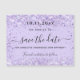 Uma Imã salve a data para uma festa de aniversário (ou qualquer idade). Um fundo de cor violeta, lavanda, decorado com pó de brilho falso. Personalize e adicione uma data e nome/idade. O texto: Salvar a Data é gravado com um script de estilo com letra de tendência grande com alternâncias.