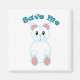 Um adorável urso polar branco chora enquanto pensa sobre o futuro ambiental e a extinção. O texto azul diz, "Salve-me".