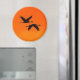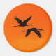 Íman redondo de 3" com imagem de dois guindastes de Sandhill voando para um pôr de sol laranja