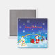 Linda paisagem de neve com uma árvore de Natal, flocos de neve, e um arco-íris sobre o céu. Papai Noel está acenando e duas renas estão juntas para distribuir presentes de Natal.