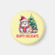Santa Paws Says Happy Holidays magnet. A chubby cat lounges beside the glittering Christmas tree, eyes half closed in festive bliss, purring softly as if to say, Happy holidays, may your treats be plenty and naps long.