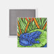 Imagem é minha pintura acrílica original. Este vibrante sapo venenoso azul com manchas pretas está sentado sobre uma almofada verde-clara brilhante na água com grama verde e hastes amarelas atrás dele. O céu de fundo é laranja vibrante. Veja minha loja Art by MAR para combinar produtos com este design.