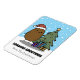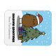 Um ímã de Natal fofo com uma batata de desenho animado em uma cena natalina caprichosa. A batata está em frente a uma árvore de Natal com luzes e uma estrela no topo. O fundo é uma cena de inverno com neve. Na frente, há modelos para adicionar seu nome e mensagem para personalizar.