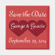 This Save the Date refrigerator magnet features two crimson hearts side-by-side with the names of the bride and groom across them in a white font on a muted pinkish-red background. The words "save the date" appear above the hearts, and the date appears below. Design can be customized for an engagement party, bridal shower, rehearsal dinner, wedding, anniversary or valentine's party save-the-date or party favor.
