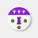 "Argent, uma torre purura entre duas maçãs em xadrez e uma maçã em vert base e em um grande purpuro arame de três flechas."