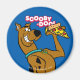 Check out Scooby-Doo sitting with a big smile, holding up a slice of stuffed crust pizza.