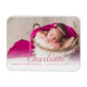 Ímã de anúncio de nascimento de bebê menina com foto para apresentar sua linda recém-nascida. Com uma foto de bebê que ocupa toda a área, um nome em letra cursiva rosa e estatísticas de nascimento.