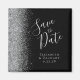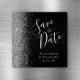 A borda esquerda desta Imã salve a data elegante apresenta uma borda cintilante de falso prateado. O texto personalizável combina o script de escrita manual da cinza prateada com a fonte serif em um plano de fundo preto.