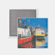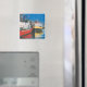 Imagem de frigorificador com uma pintura de Portland, Maine Fireboat "City of Portland" e dois Casco Bay Ferries encaixaram no Pier do Estado do Maine. Esta pintura colorida usa predominantemente cores primárias e detalhes complexos do Barco de Fogo Portland, ao mesmo tempo que incorpora um estilo de pintura para dar textura e interesse visual da pintura e retratar uma típica cena de Verão em Portland, a vibrante frente d'água do Maine. Reflexões vermelho-claro e amarelo na água azul-mármore dão aos navios uma sensação de movimento constante, mesmo quando atracados.