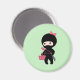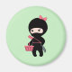 Cute cartoon ninja girl dressed in black but for a pink bow on top of her head mask. Traditional Japanese katana sword can be seen strapped to her back, it’s handle also colored pink. The girl is holding a pink shopping basket.