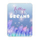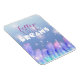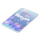 Belo design de ímã personalizado, com penas roxas e cor-de-rosa pastel e faíscas em um fundo de gradiente azul com o texto "Siga seus sonhos" escrito em três fontes modernas diferentes.