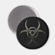 Símbolo de risco biológico enrolado sobre fundo preto.